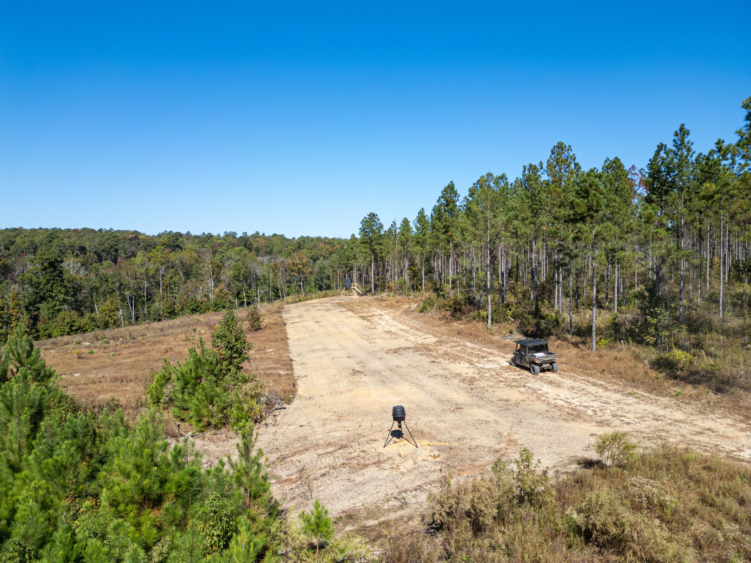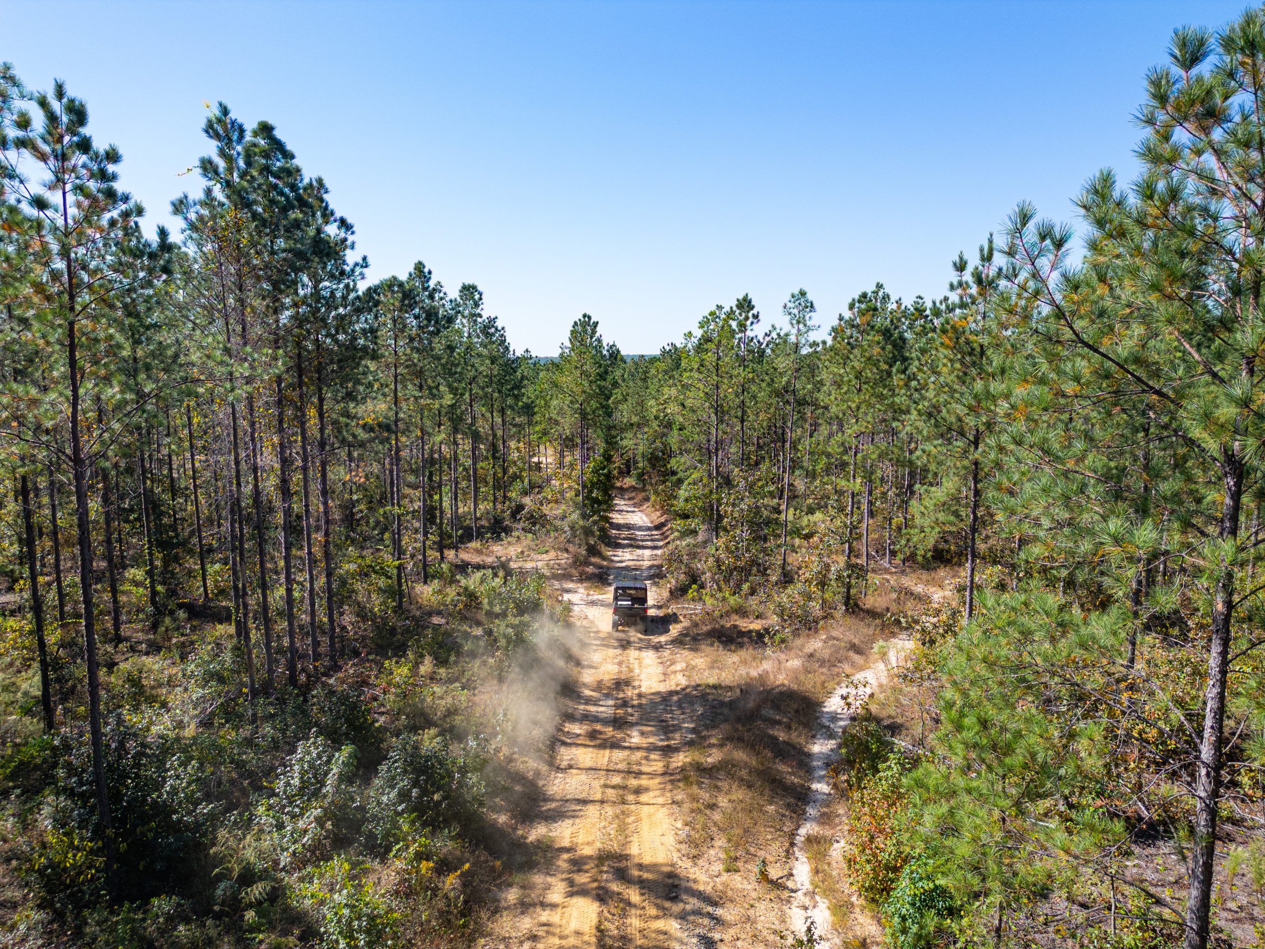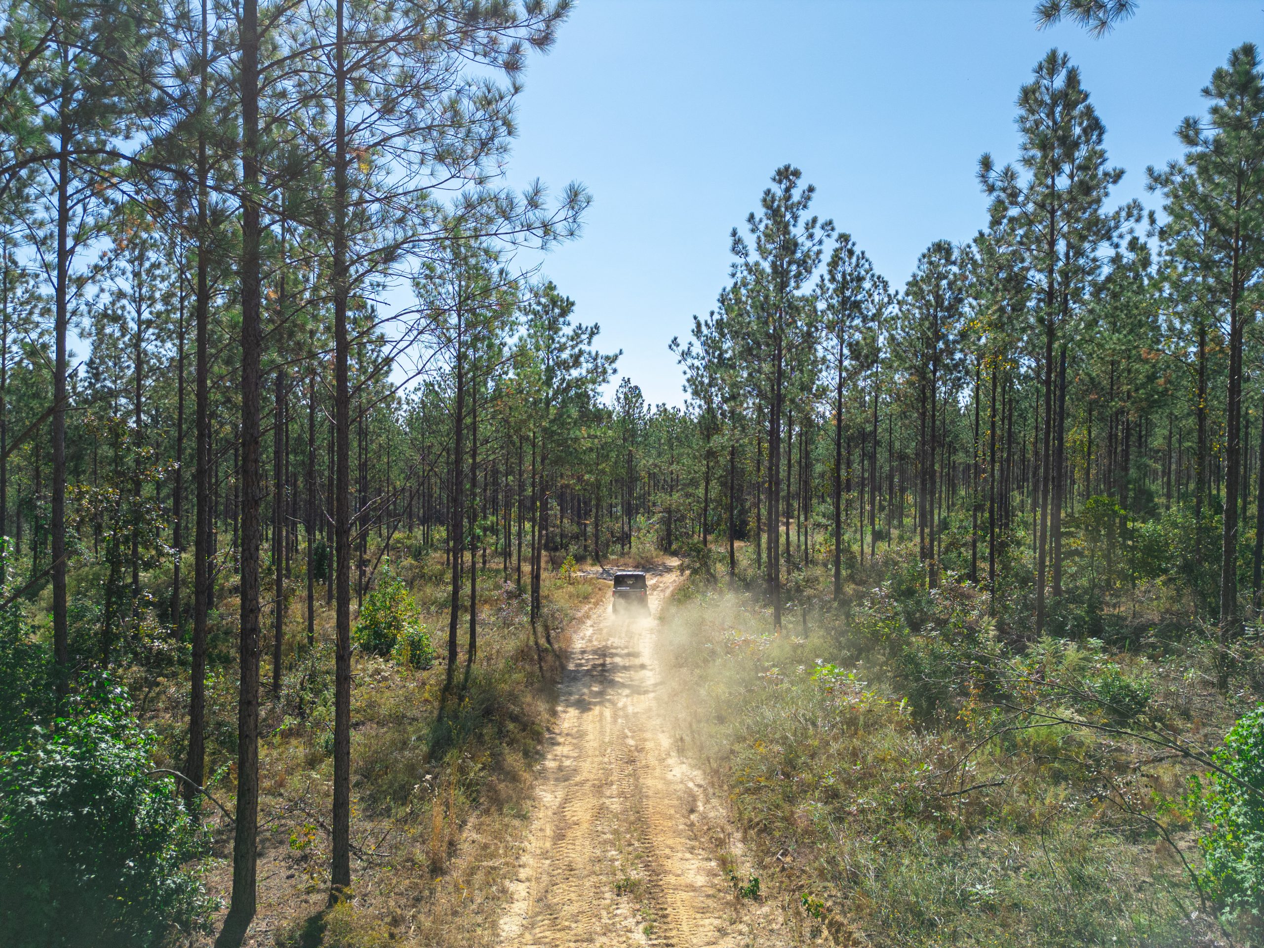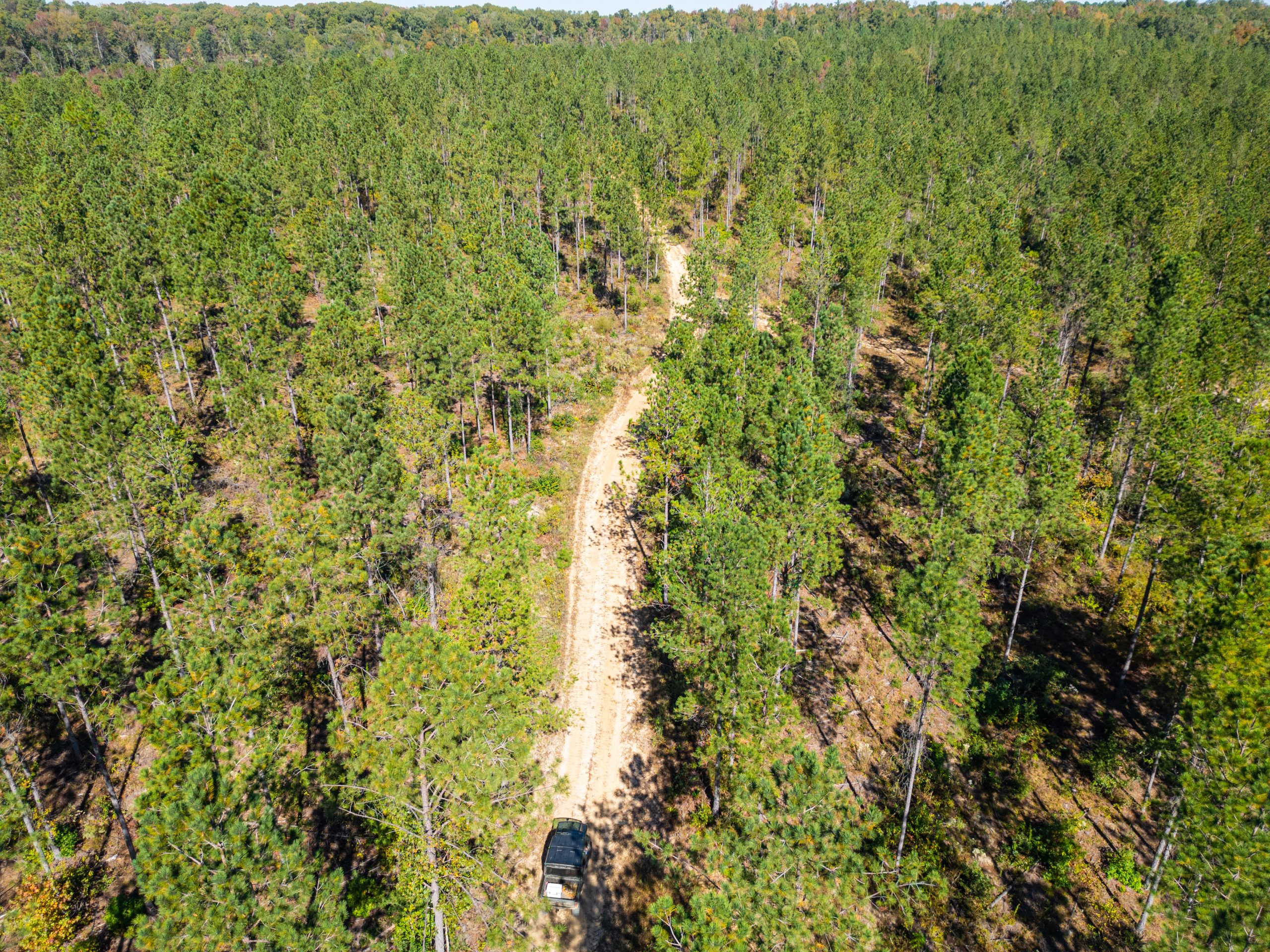 Featuring gravel road frontage just off the paved road, the tract offers an excellent internal road system that winds through rolling terrain — perfect for multiple cabin or homesite options with long, scenic views. The land is planted in pines for future timber income, with a mix of native habitat supporting abundant wildlife.